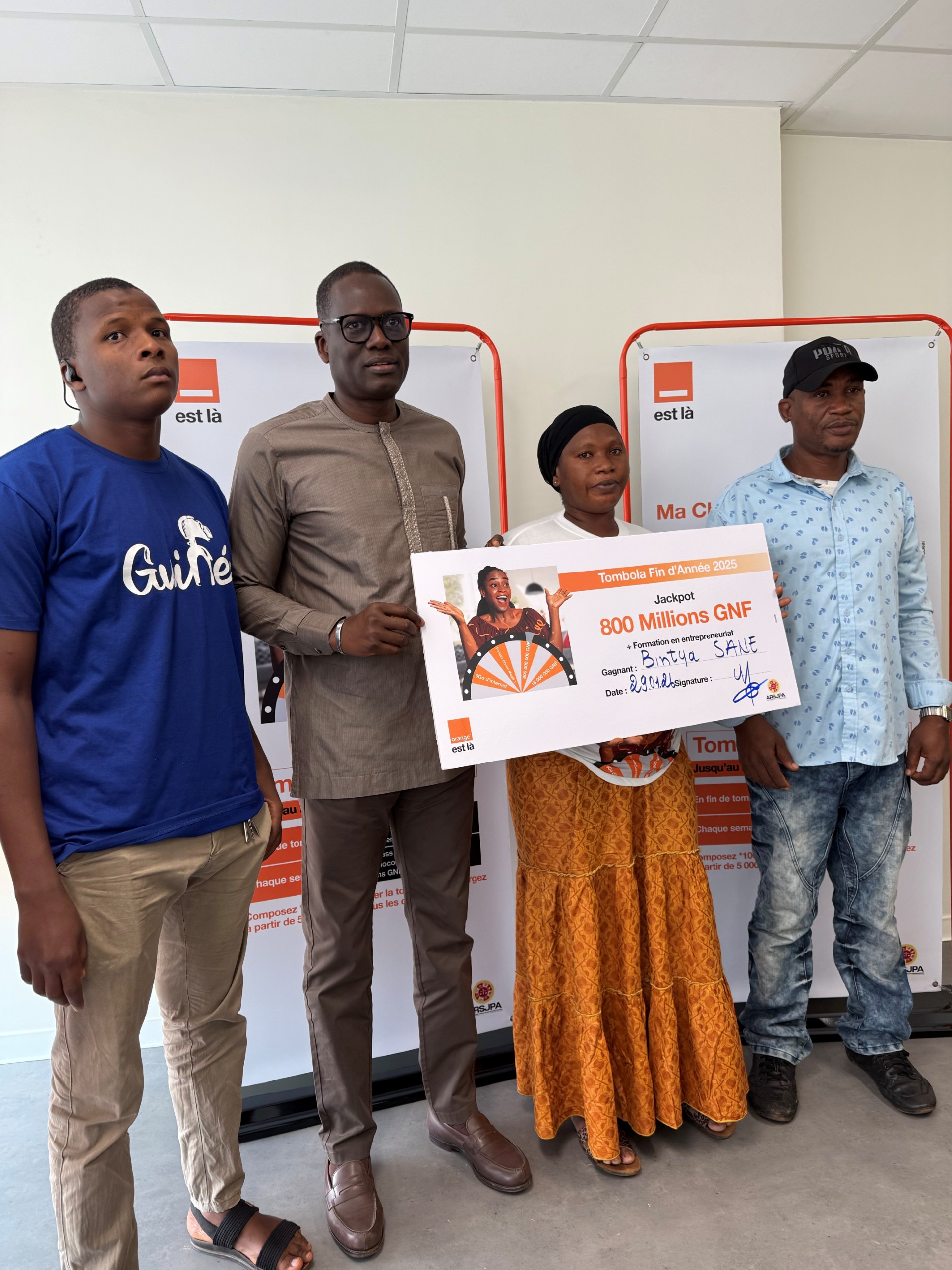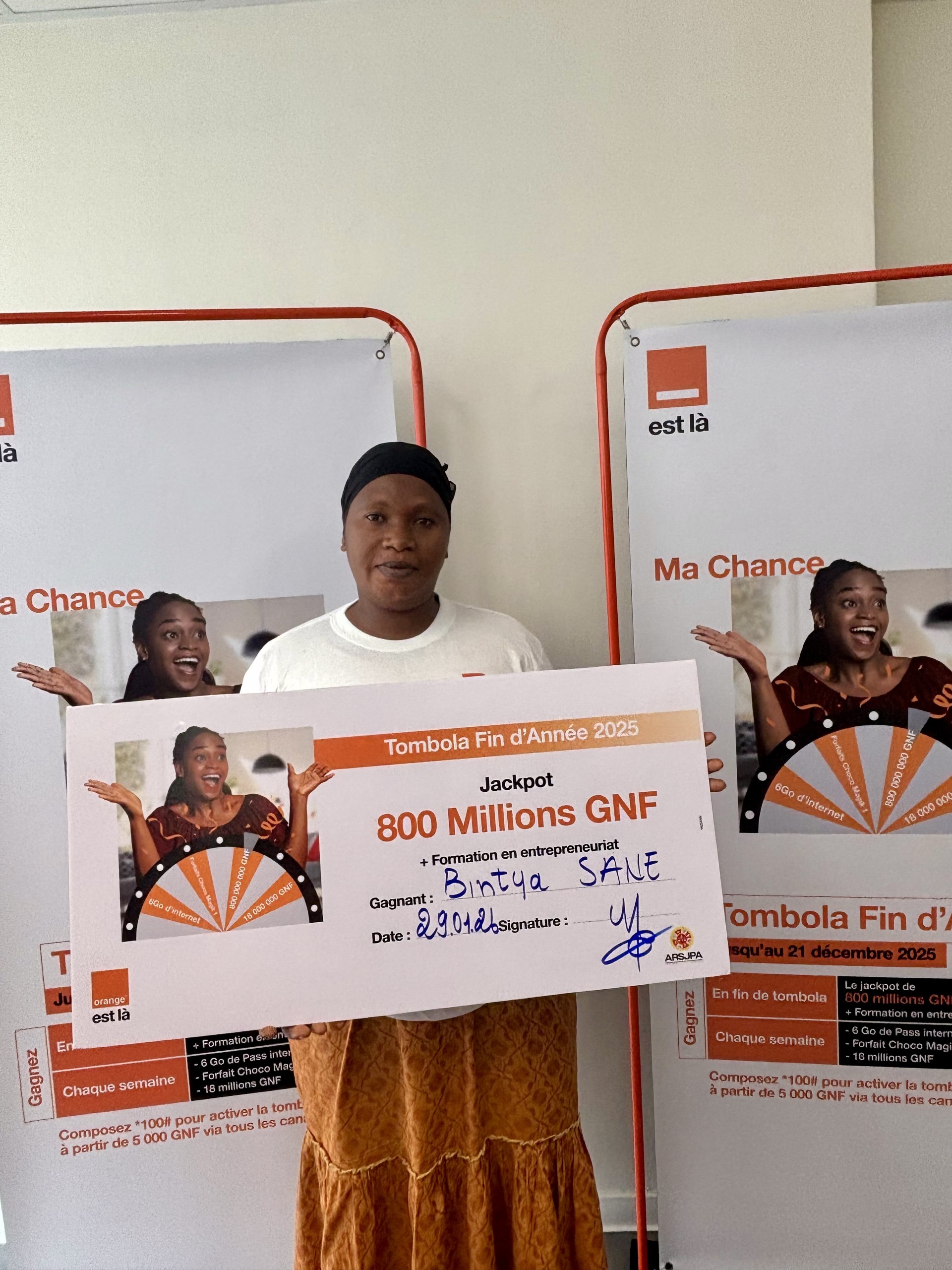 Dans le cadre de sa Tombola de fin d’année, organisée du 17 novembre au 21 décembre 2025, Orange Guinée a procédé à la remise officielle du Jackpot à la grande gagnante, Madame Bintya Sané.